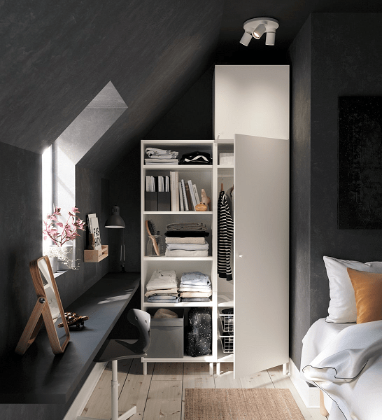 Maksimalkan juga ketinggian dinding di kamar tidur untuk menciptakan ruang penyimpanan yang efisien. Karena itu pilih tipe lemari dan rak yang akan kita gunakan menyesuaikan dengan bentuk ruang kamar serta banyaknya barang yang dimiliki.